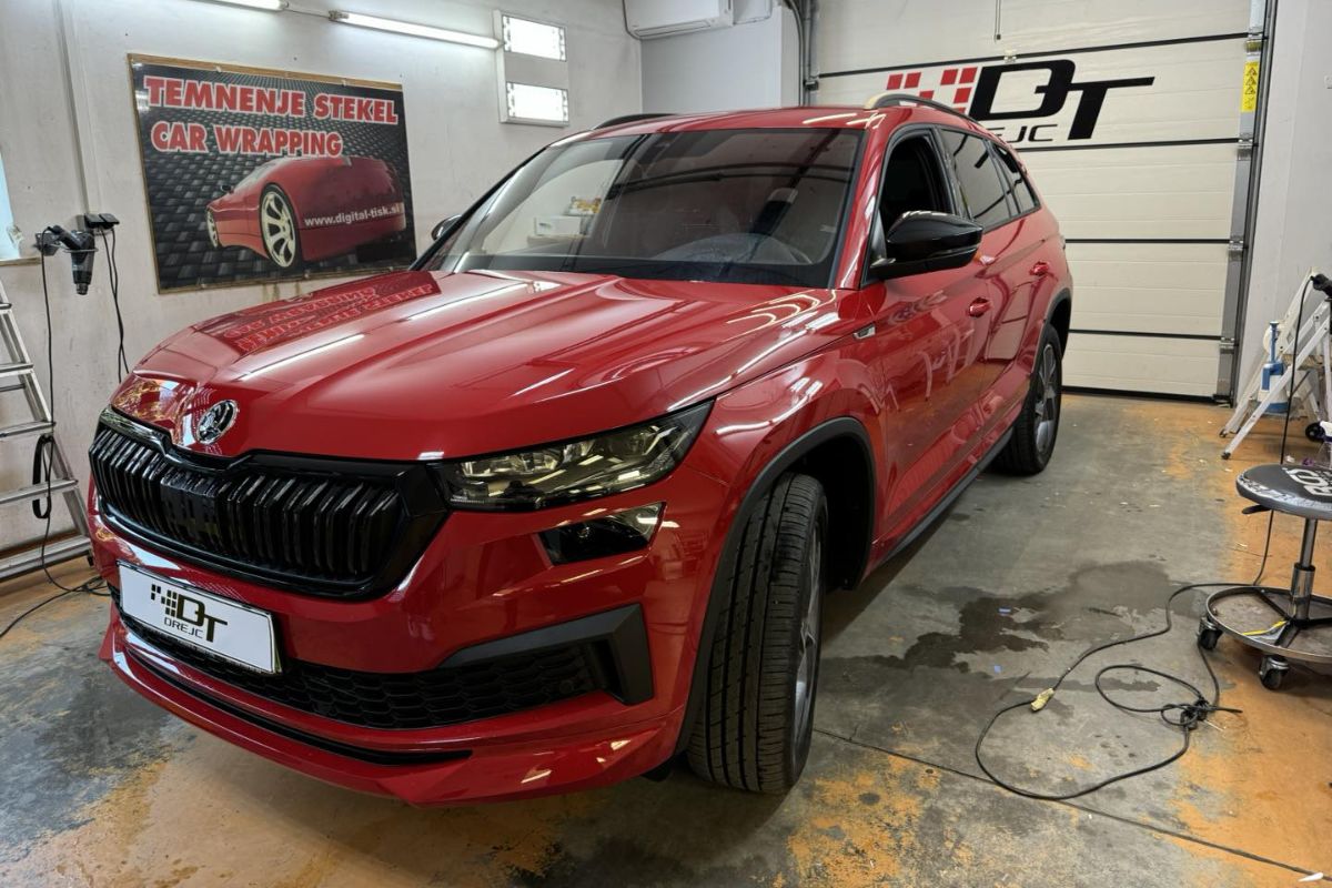 Škoda Kodiaq Stekla zatemnjena s 95% folijo. Pokrov motorja zaščiten s prozorno zaščitno folijo.