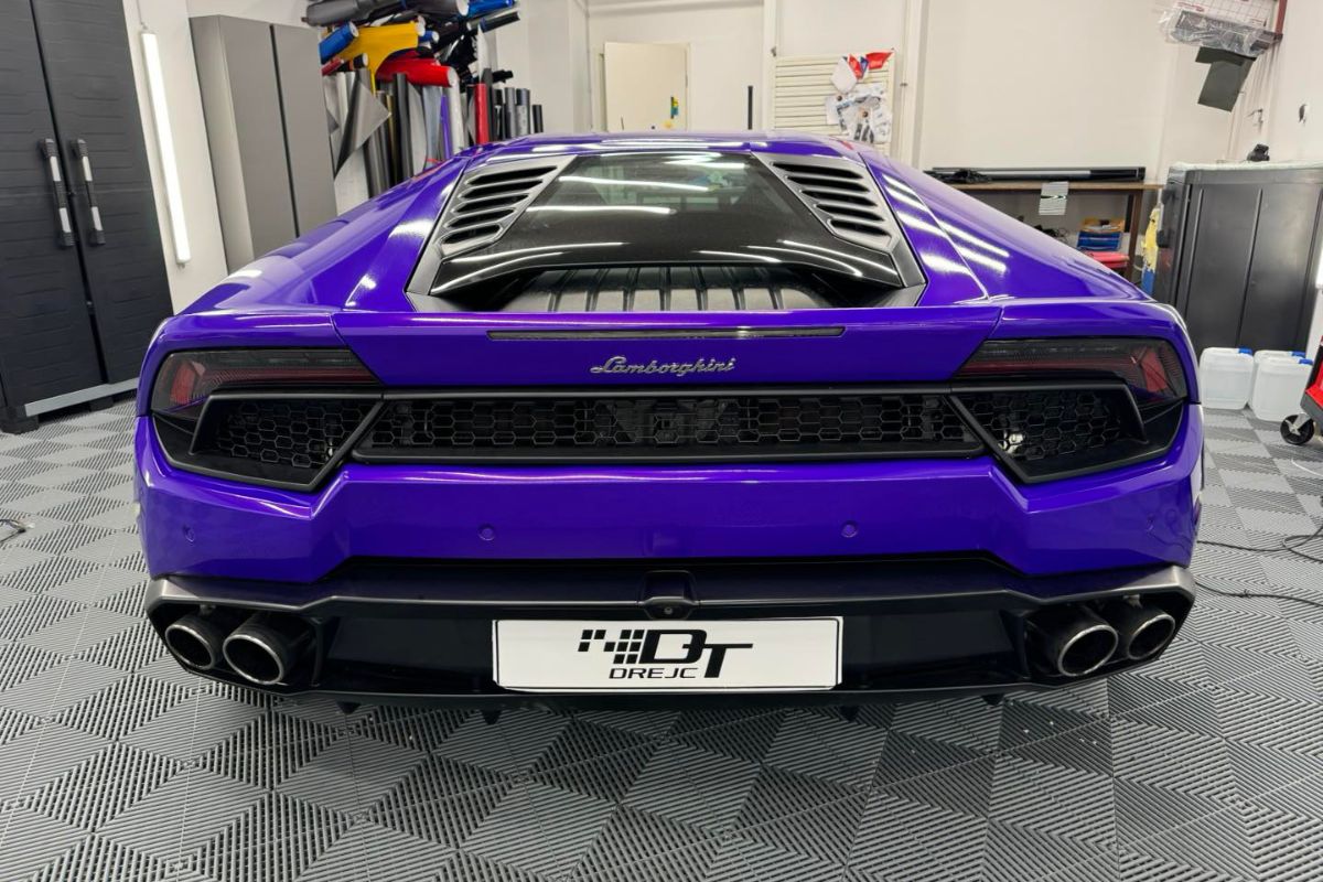 Lamborghini Huracan Vozilo oblečeno v plum explosion sijaj folijo.